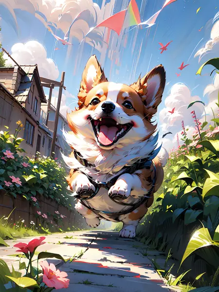 프롬프트: Master works, high quality, film quality, a dog, corgi, flying in the sky, with sun goggles, clouds, rainbows, wings, MG keji, solo,