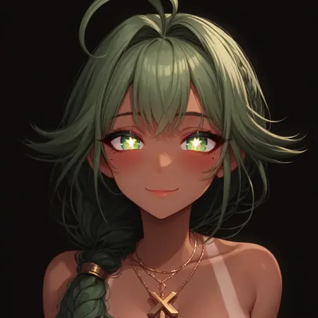 Low-tied braid, tanned, symbol shaped pupils, green hair, green eyes,
