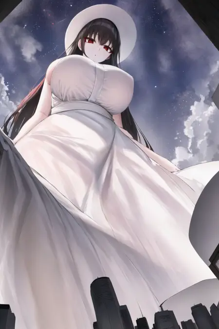 표준 복장 커스터마이징을 원할 경우 추천하는 프롬프트: hasshaku-sama, 1girl, solo, black hair, long hair, dress, white headwear, white dress, sky, sun hat, large breasts, blue sky, looking at viewer, cloud, bangs, red eyes, cleavage, bare shoulders, open mouth, sleeveless dress, day, :d, hair over one eye, sundress, hair between eyes, outdoors