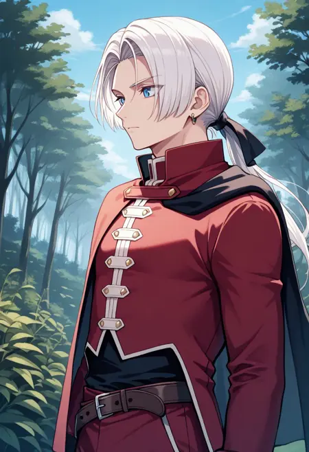 kukuru, 1boy, male focus, solo, white hair, long hair, ponytail, hair ribbon, black ribbon, jewelry, earrings, blue eyes, shirt, black shirt, jacket, red jacket, cape, belt, pants, red pants, boots, knee boots, white footwear, gloves, brown gloves,