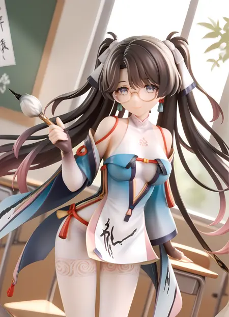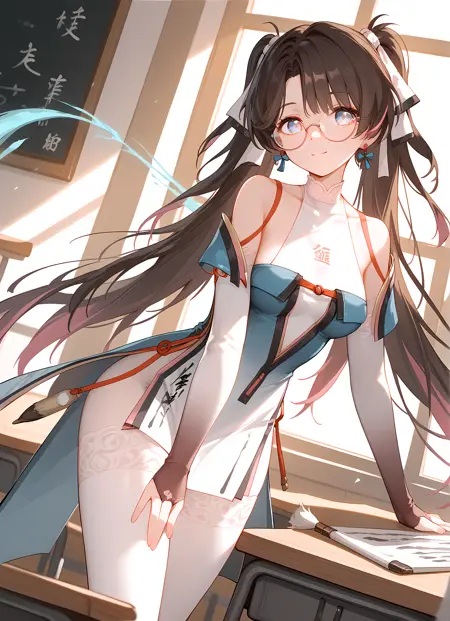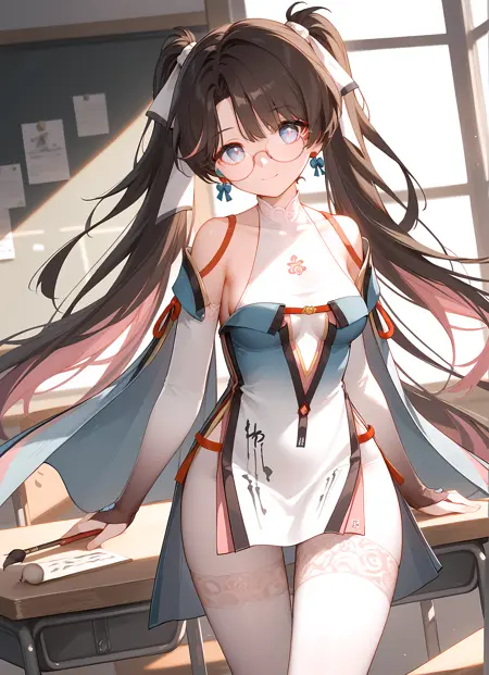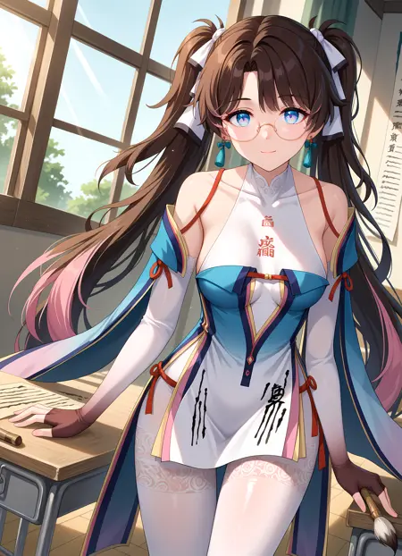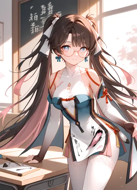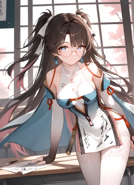 옷차림 → dress, bare_shoulders, paintbrush, white_pantyhose, pantyhose, chinese_clothes, clothing_cutout, thighhighs, white_thighhighs, scroll, gloves, detached_sleeves, long_sleeves,