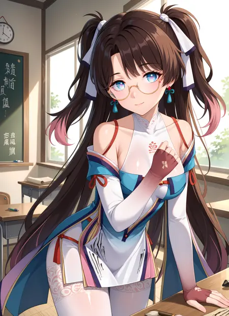 외모 → ohwx, 1girl, solo, long_hair, glasses, earrings, jewelry, breasts, ribbon, hair_ribbon, black_hair, brown_hair, multicolored_hair, two_side_up, blue_eyes, medium_breasts, round_eyewear, twintails, very_long_hair, semi-rimless_eyewear, white_ribbon, pink_eyes, pink_hair, purple_eyes,