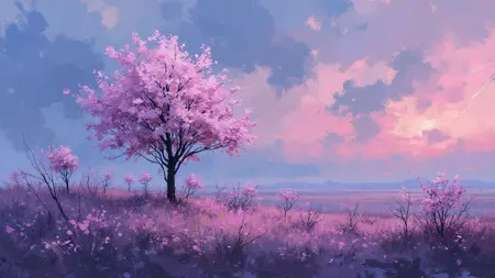 따뜻한 색조와 벚꽃이 있는 인상파 회화.