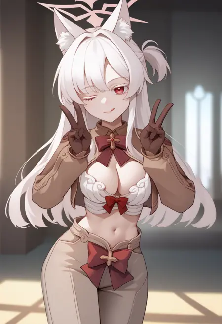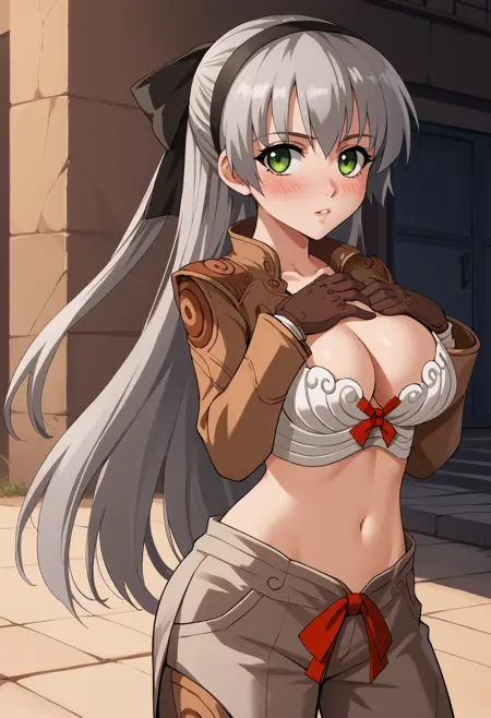 トリガー+外見: ragnarokthief, brown jacket, cropped jacket, open jacket, long sleeves, white bra, bow bra, red bow, brown gloves, brown pants, capri pants, midriff, navel, cleavage