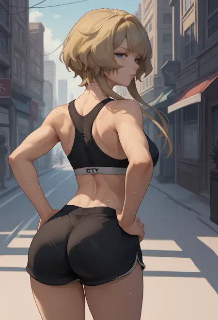 トリガー+外見: sandrone, 金色の髪, 長い束になった短髪, 青い目