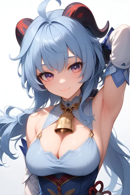 - 1girl, solo, 青髪, 角, 山羊の角, 長髪, 紫色の目, 髪の花, 前髪, 横髪