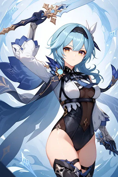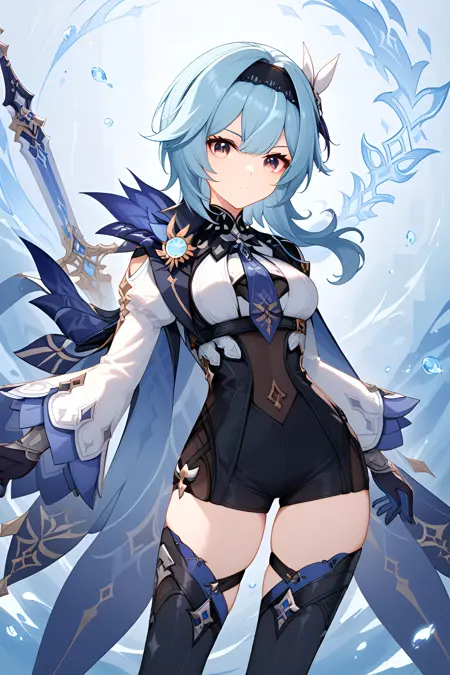 - 1girl, solo, 青い髪, ヘアバンド, 黄色い目, ビジョン(原神), 黒いヘアバンド, 髪飾り, 中程度の長さの髪, サイドロックス, 前髪, 目の間の髪