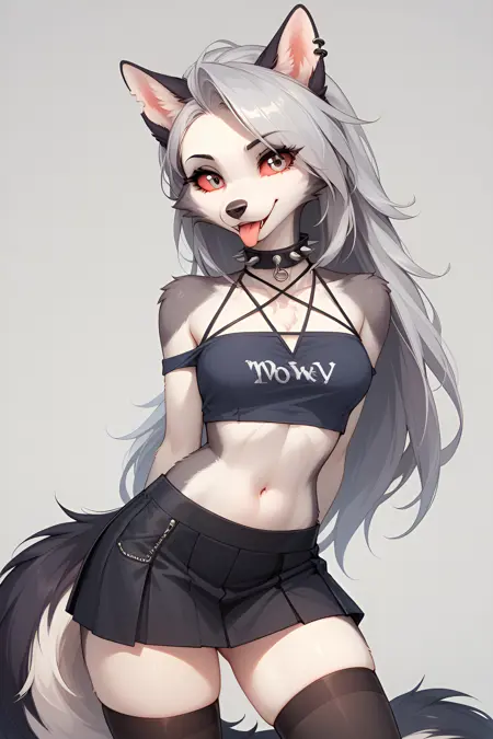 - 1girl, solo, colored sclera, furry, spikes, wolf ears, animal ears, wolf girl, furry female, long hair, black sclera, body fur, grey hair, red sclera, red eyes, white fur, grey fur, wolf girl, navel, tail, fangs, claws
