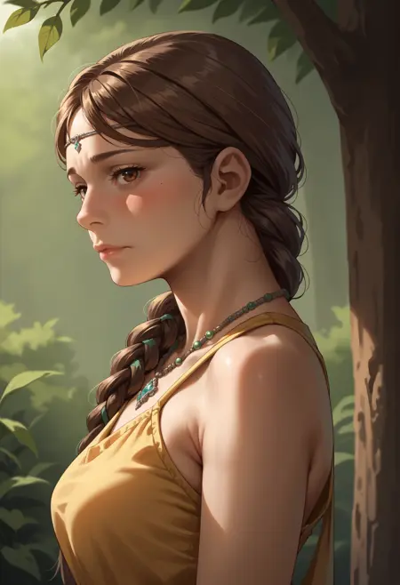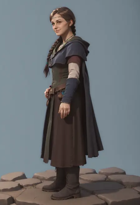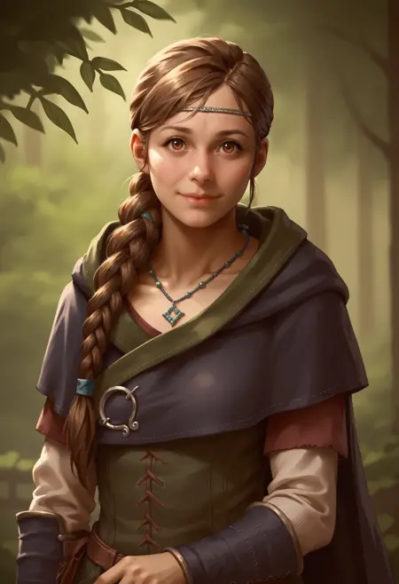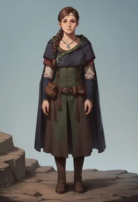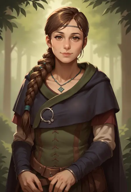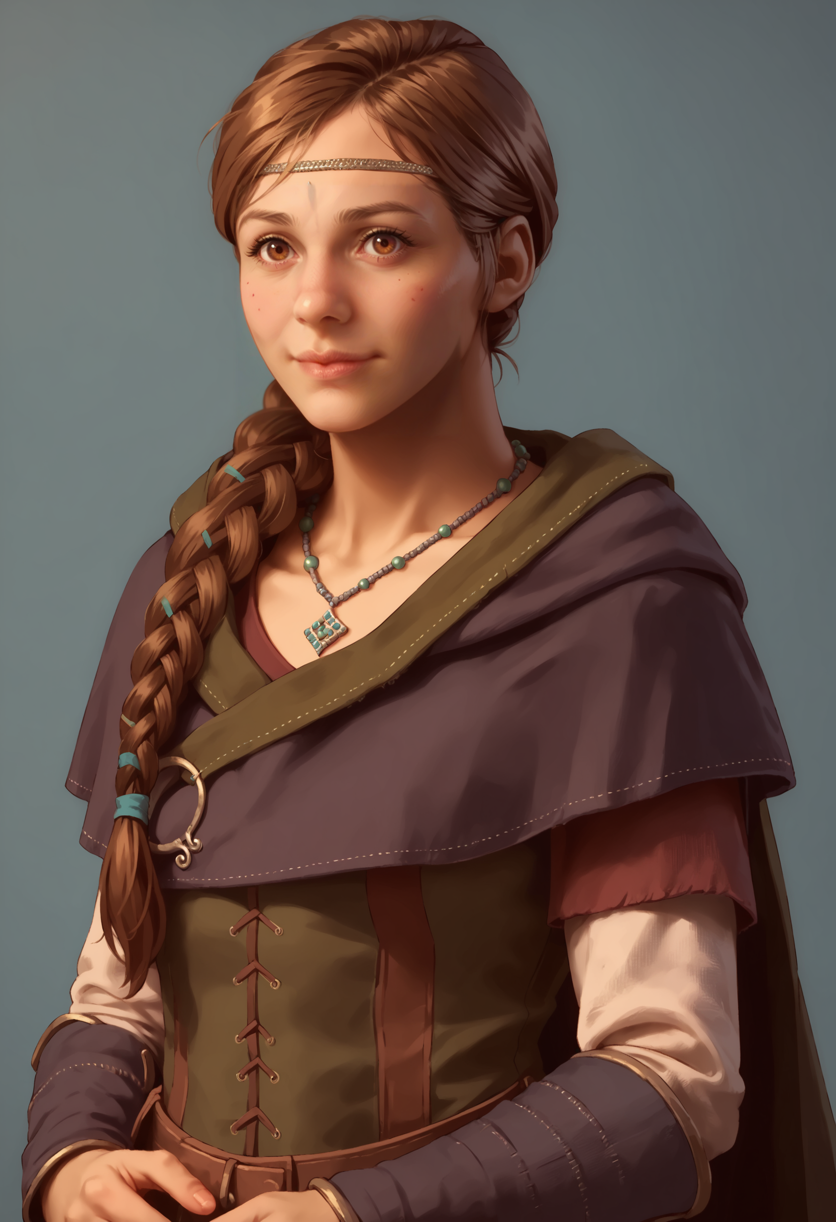 1girl, 갈색 머리, 긴 머리, 땋은 머리, 갈색 눈, 단일 땋은 머리, 어깨에 걸린 머리, 목걸이, 관모, 망토