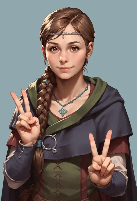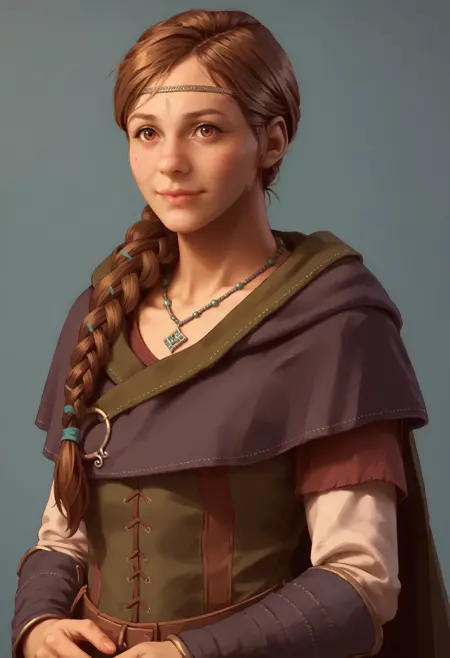 1girl, brown hair, long hair, braid, brown eyes, single braid, hair over shoulder, necklace, circlet, cape