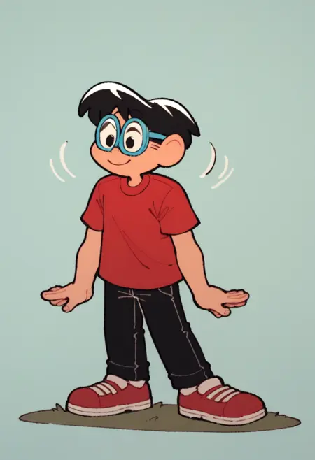 ZeLuisTDM, 1boy, black hair, red shirt, light blue glasses, tall, black pants, red shoes