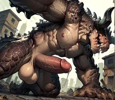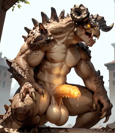 タグ: d3athclaw、モンスター、生物、うろこ、質感のある皮膚、角、鋭い歯、爪、三本指、尾、トゲ、背中のトゲ、黄色い目、趾行性、こぶ背、筋肉質、など...