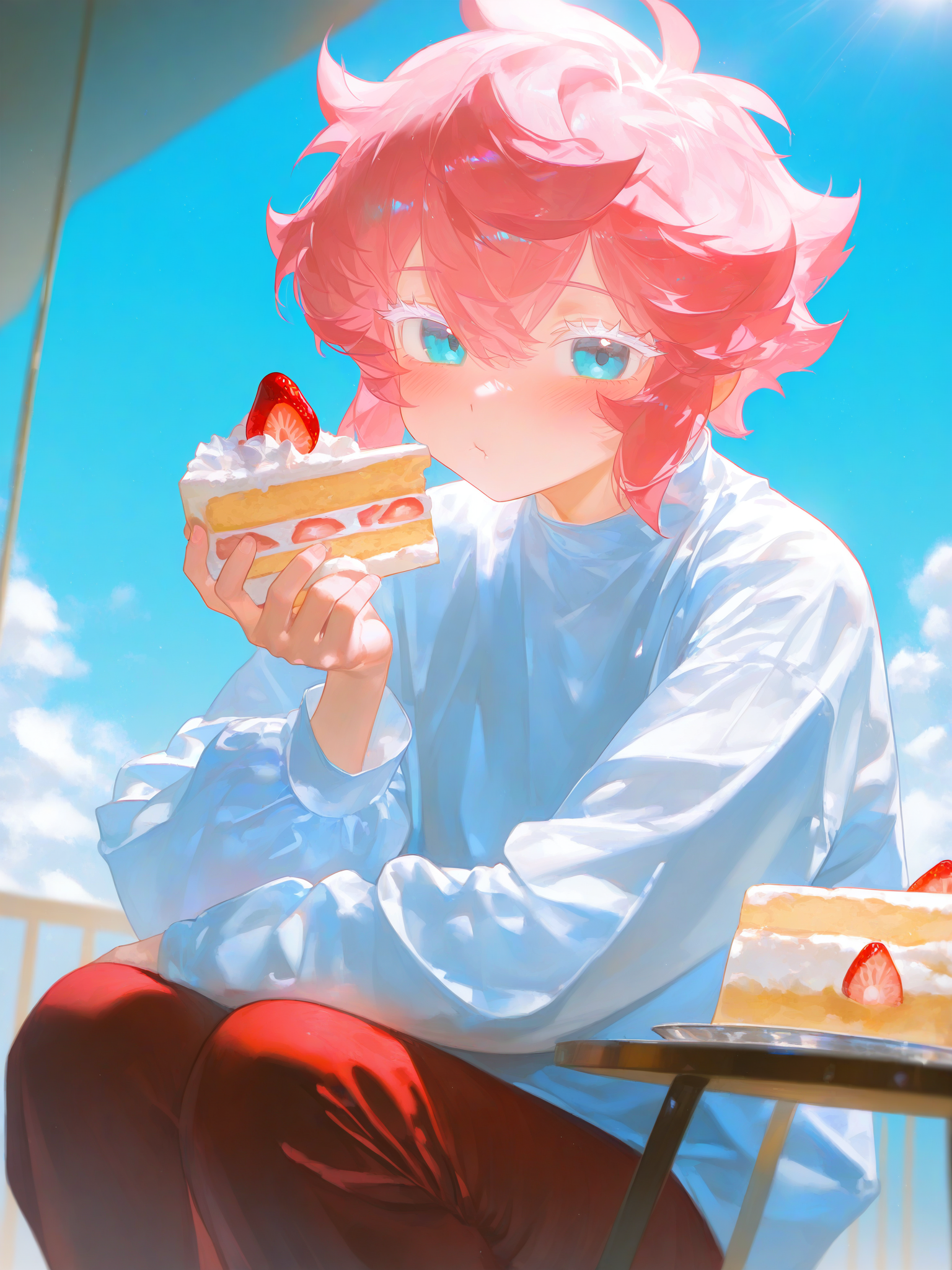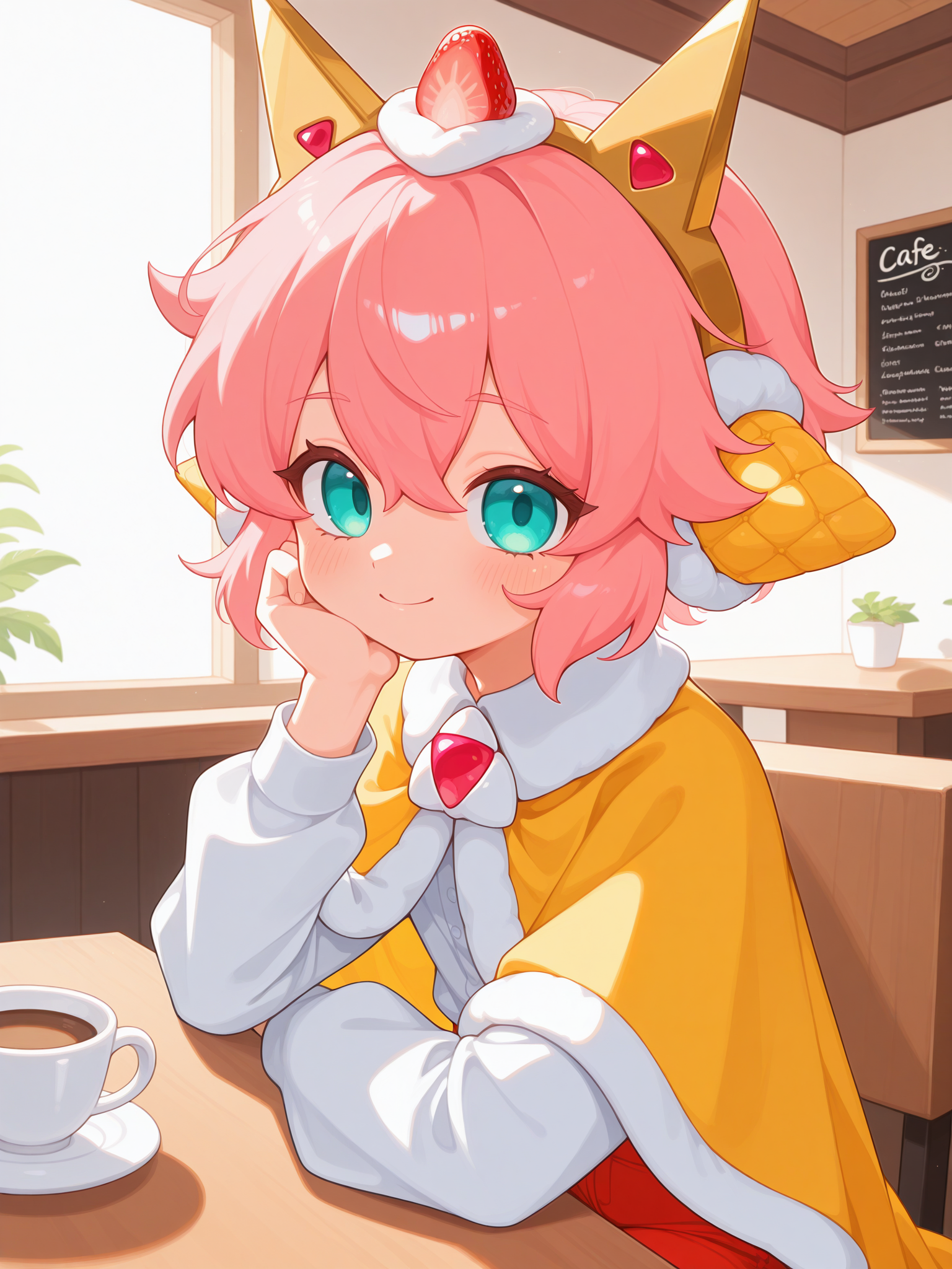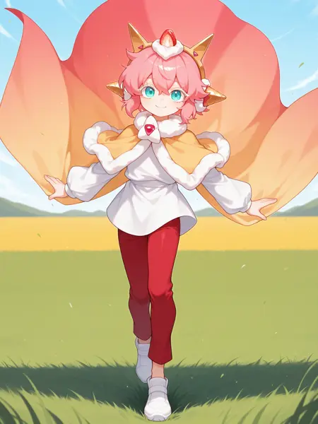 분홍색 머리, 흰색 속눈썹, 노랑색 망토, 그라디언트 망토, 빨간 망토, 긴 소매