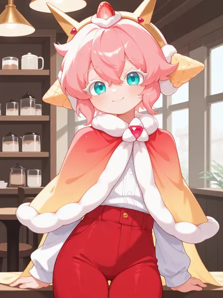털 장식이 있는 카프레, 금색 헤드기어, 딸기 모양 머리 장식, 빨간 바지, 흰 셔츠, 원뿔형 귀마개