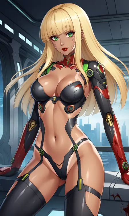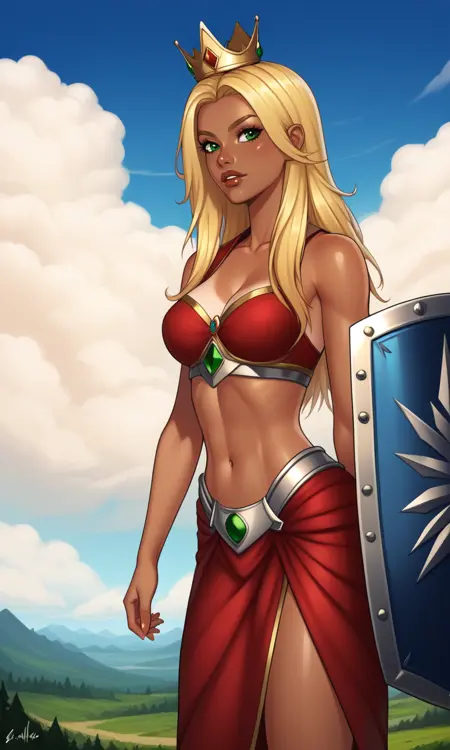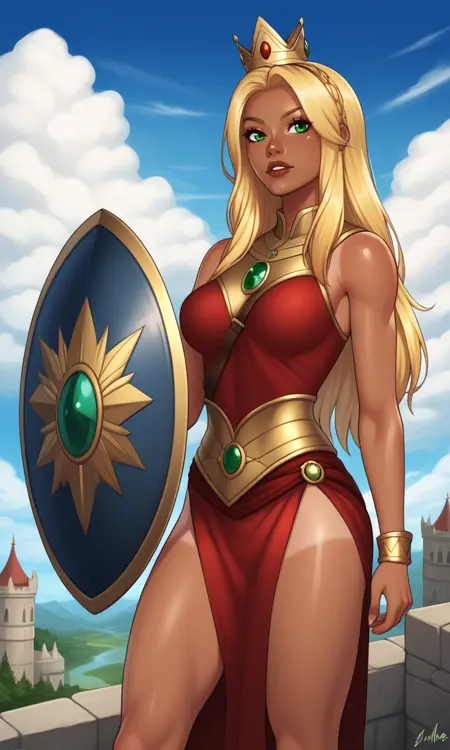 1woman,long hair,blonde hair,dark skin,tan skin,green eyes,black dress,short dress