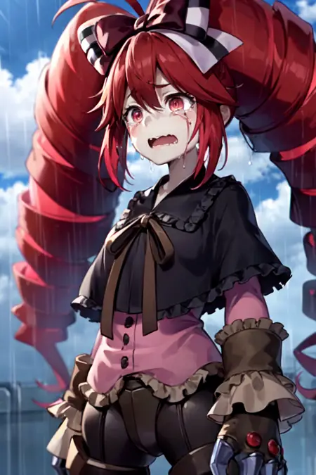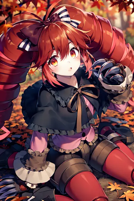 - frilled capelet, pink shirt, mechanical hands, claws, frilled cuffs, mechanical legs, shoes