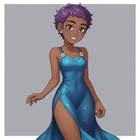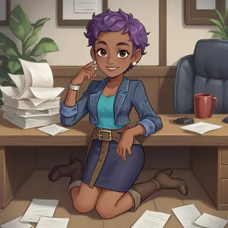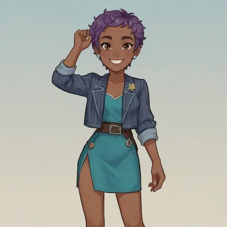 옵션: 검은 피부를 가진 여성, 단발, 보라색 머리, 갈색 눈, 주근깨, 줄무늬 자켓, 파란색 셔츠, 흰 치마, 갈색 벨트, 갈색 부츠, 하이힐, 귀걸이, 팔찌, 손목시계
