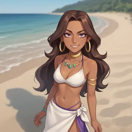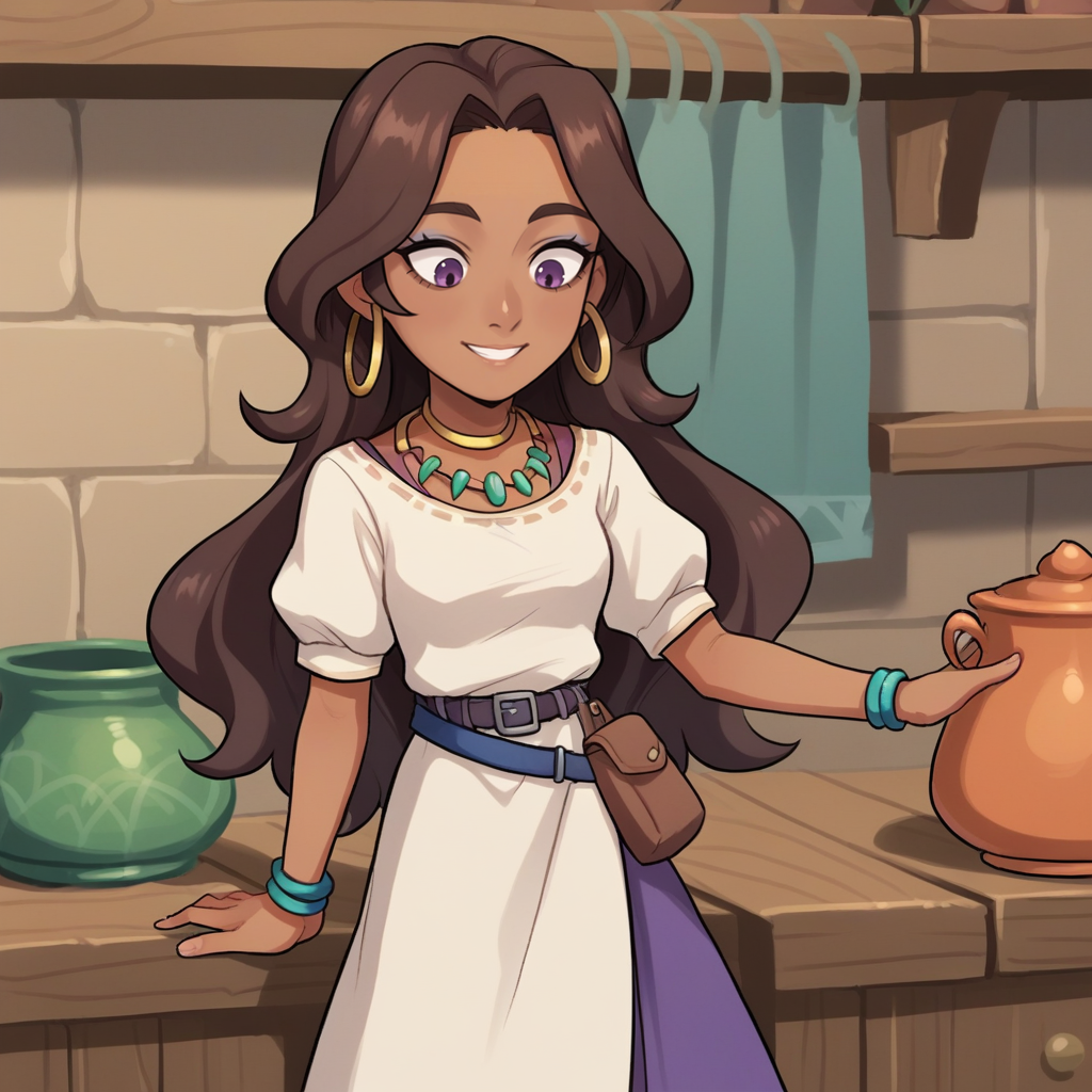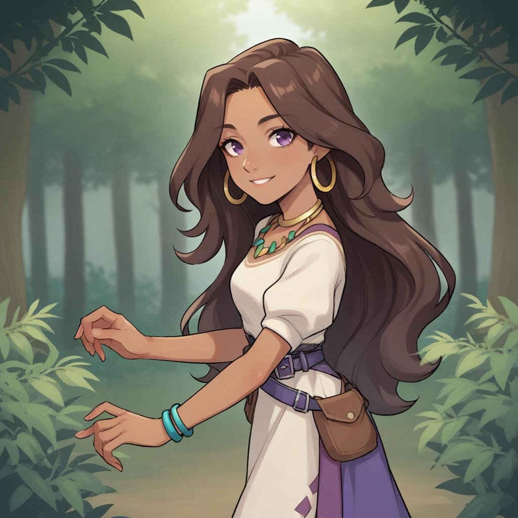 옵션: 검은 피부를 가진 여자, 갈색 머리, 긴 머리, 보라색 눈, 메이크업, 고리 귀걸이, 목걸이, 드레스, 짧은 소매, 불룩한 소매, 부츠, 팔찌, 벨트, 주머니