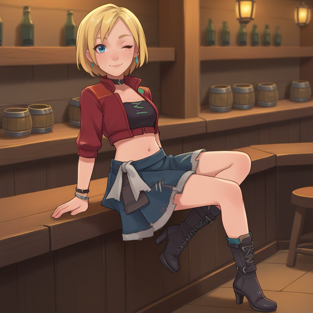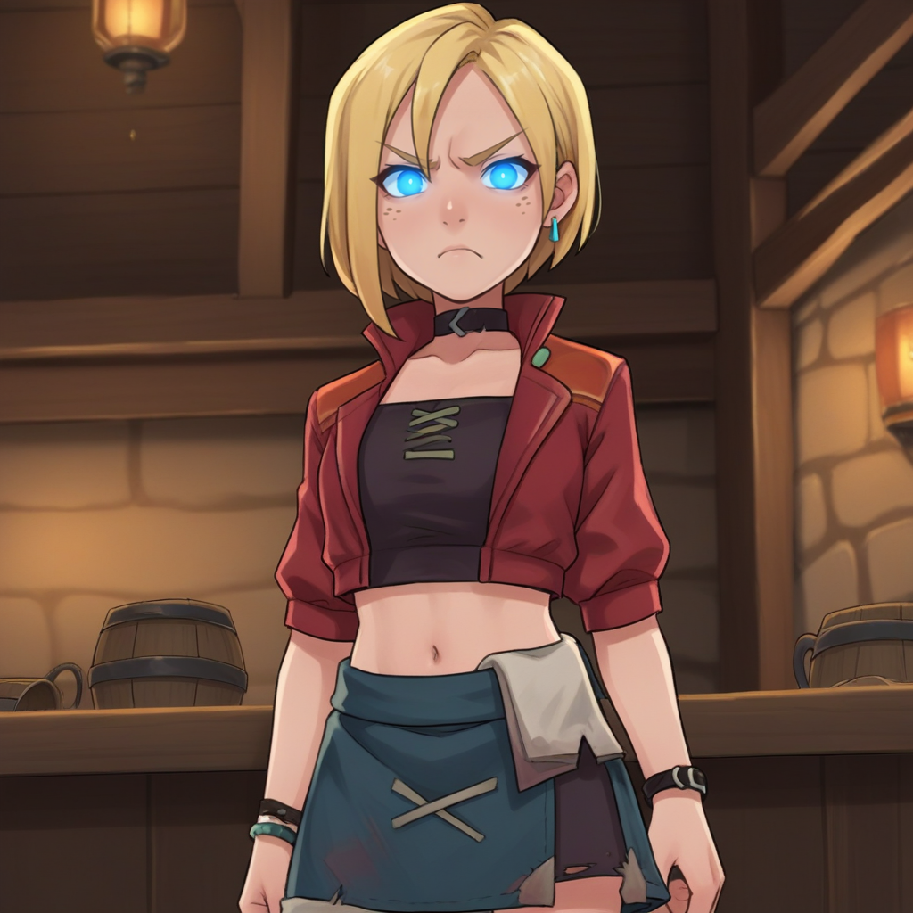 옵션: 단발, 금발, 파란 눈, 주근깨, 초컬, 빨간 재킷, 검은 셔츠, 허리, 배꼽, 치마, 발목 부츠, 하이힐, 팔찌, 귀걸이