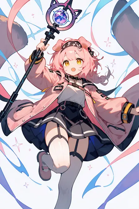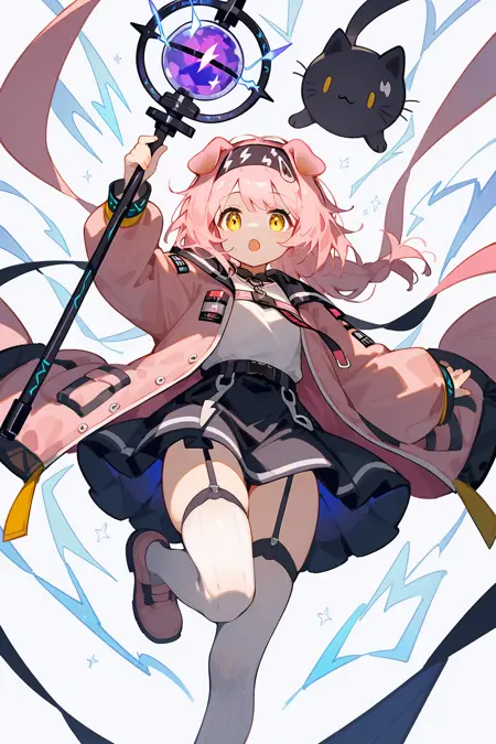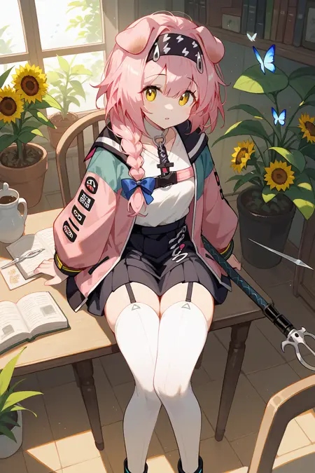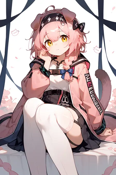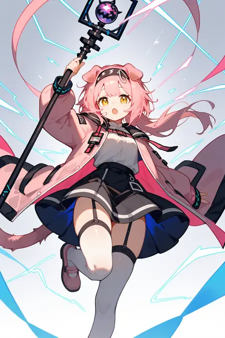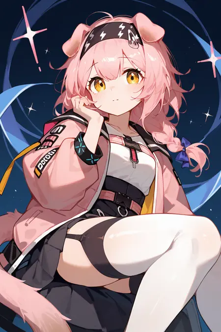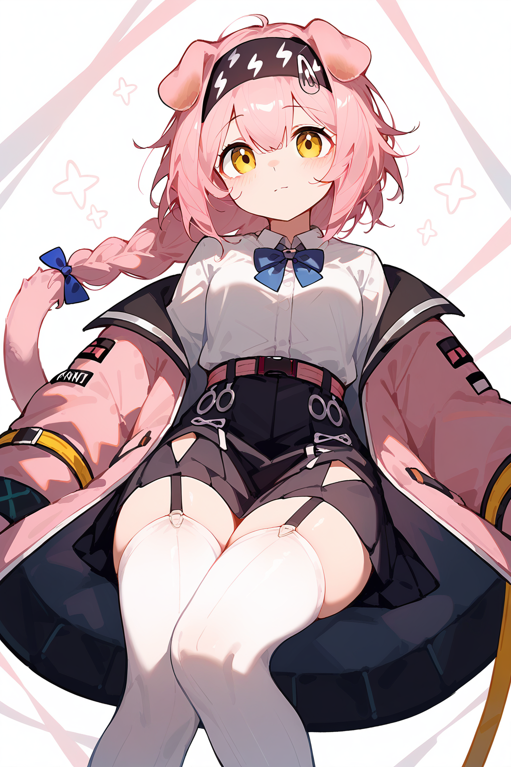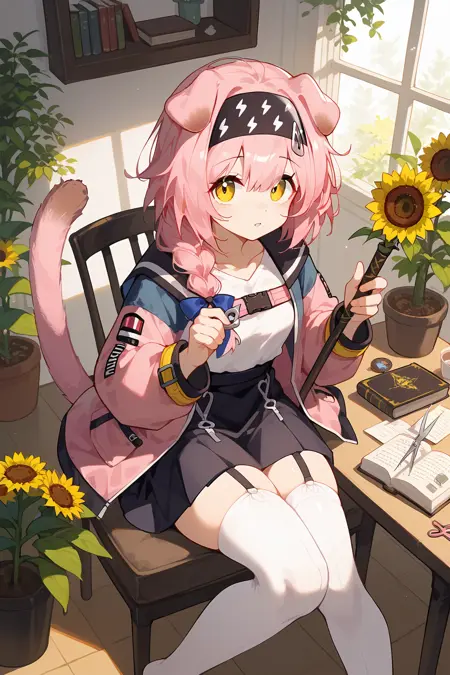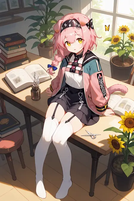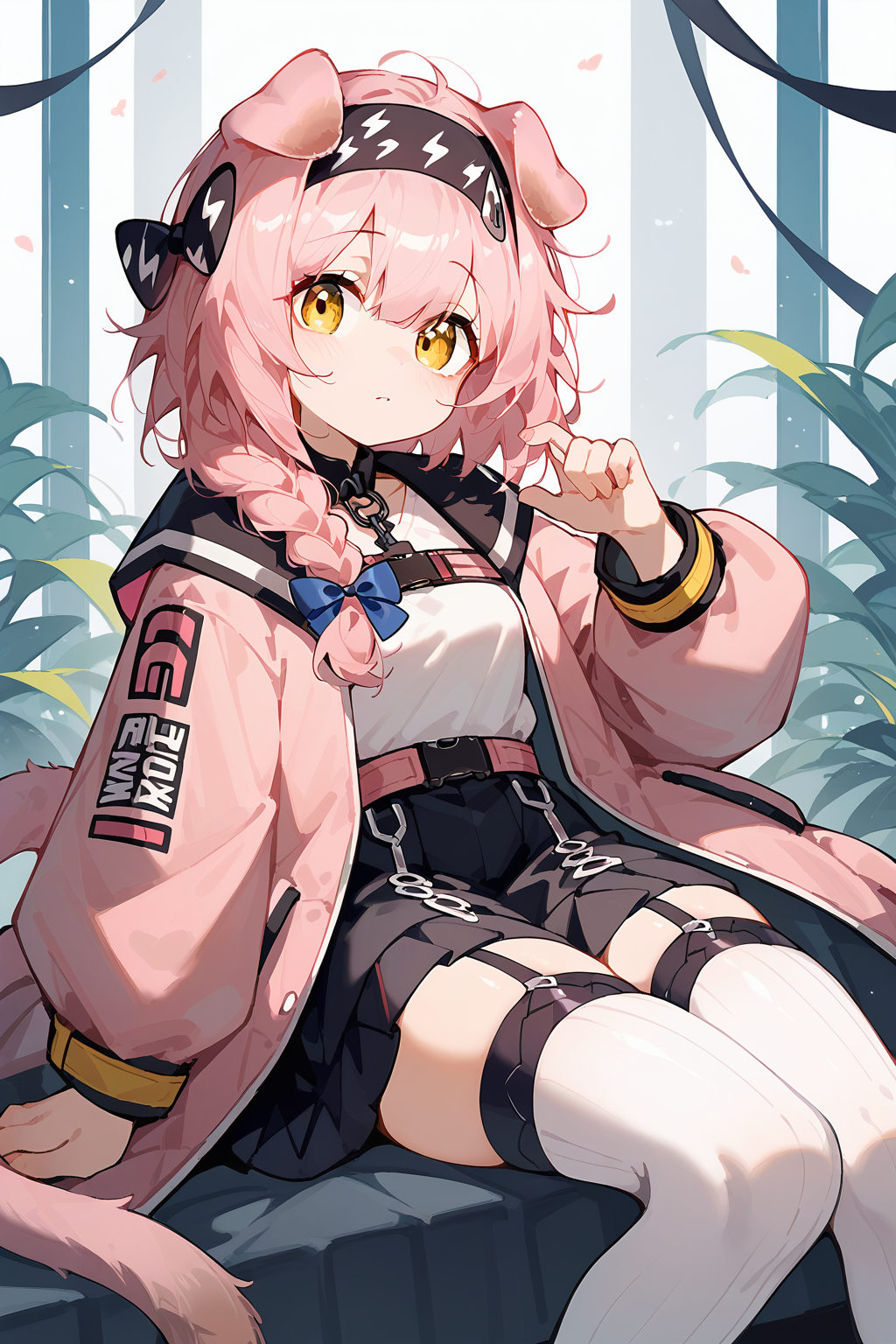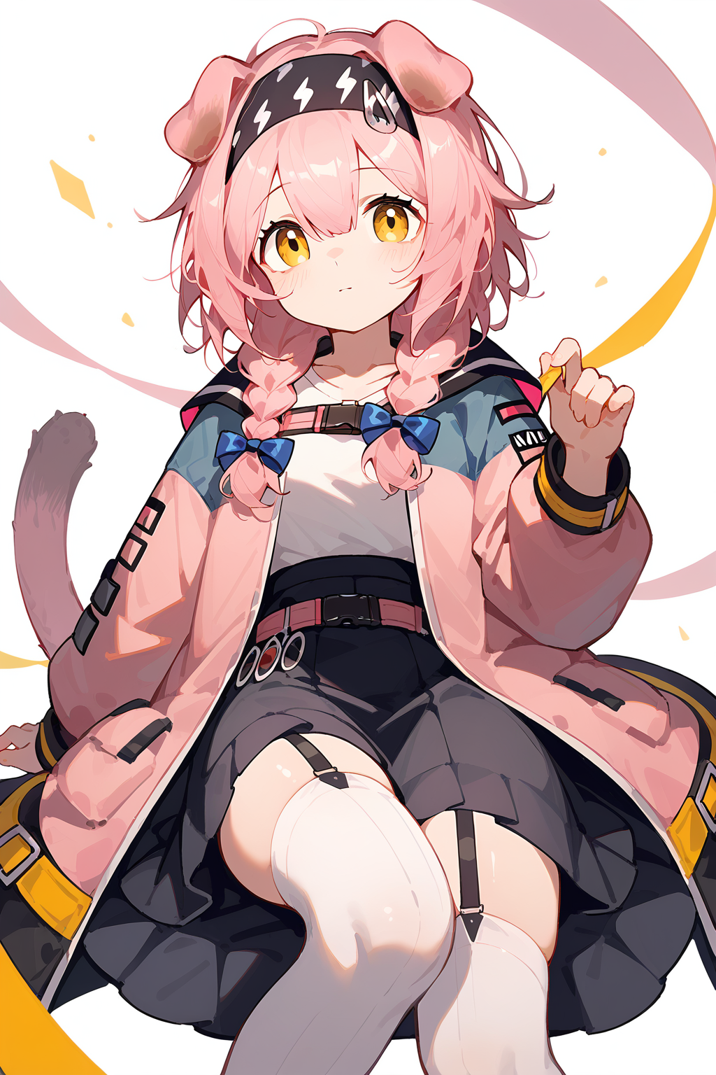 | Trained Words | goldenglow (arknights),1girl,solo,cat ears,animal ears,yellow eyes,garter straps,thighhighs,long hair,white thighhighs,braid,black skirt,pink hair,hairband,tail,cat tail,long sleeves,pink coat,jacket,pink jacket,bow,blue bow,looking at viewer,black hairband,cat girl,bangs,shirt,floppy ears,open clothes,open jacket,hair between eyes,white shirt,Copied! |