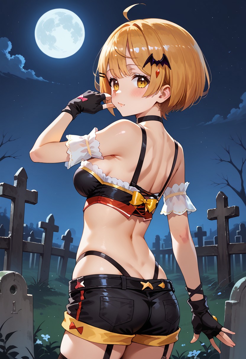 yozora_mel, 1girl, vampire, cute, blond hair, short hair, ahoge, bat hair ornament, hairclip, black choker, black fingerless gloves, crop top, yellow bow, bare shoulders, navel, midriff, short shorts, highleg panties, kneehighs, bustier, garter straps, asymmetrical legwear, single kneehigh, black boots,