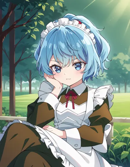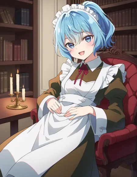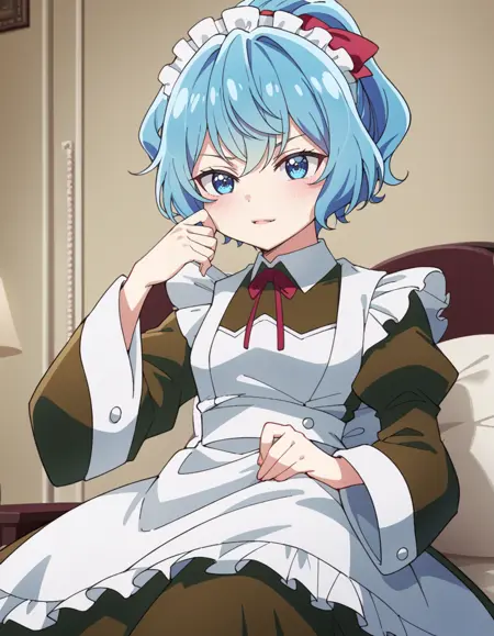 Prompt: cretia, short_hair, blue_hair, blue_eyes, maid, maid_headdress, maid_apron, long_sleeves, red_ribbon, dress, hair_bow, neck_ribbon
