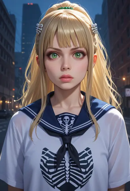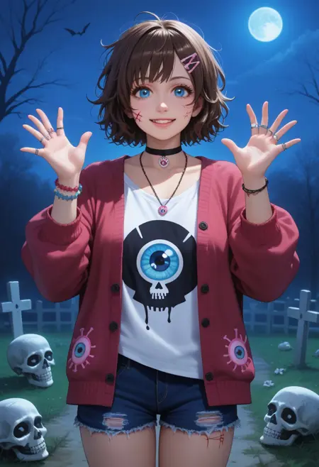 gur0k4w4, eyeball, eyeball bow, hair ornament, ribcage heart, skeleton print, bug print, print legwear, spiked headband, skeleton hand hairclip, tooth, stitches, heart on chest, blood, extra eyes