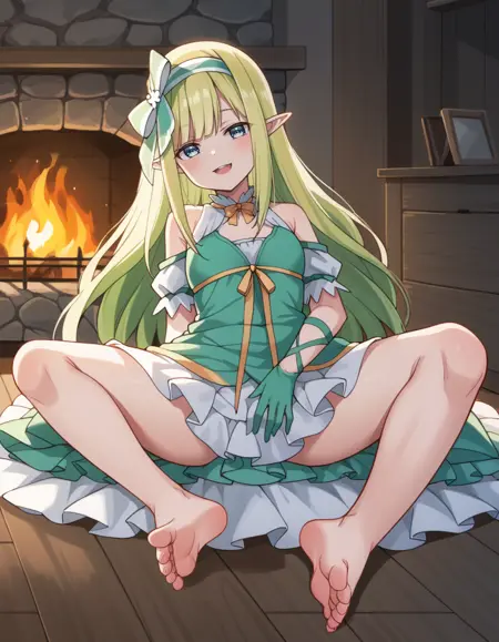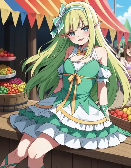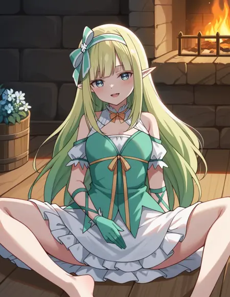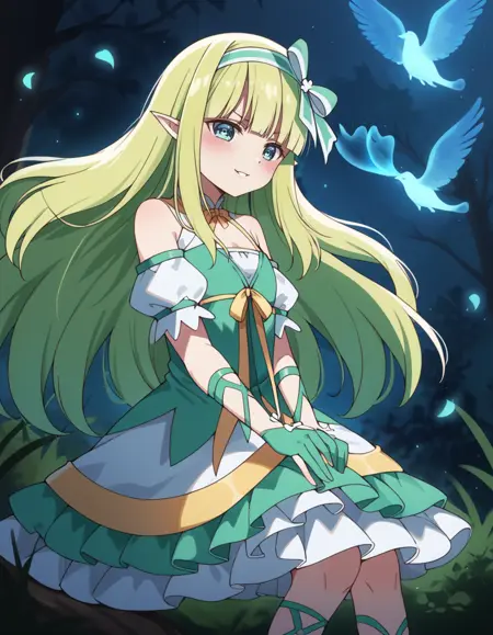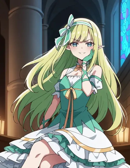 Prompt: orphia, long_hair, blonde_hair, blue_eyes, pointy_ears, elf, dress, bow, green_hairband, hair_bow, detached_sleeves, ribbon, gloves