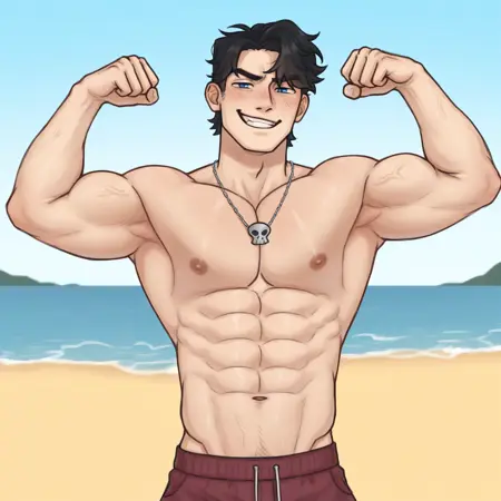 プロンプト: Hunter_DVC、黒髪、スカルネックレス、青い目