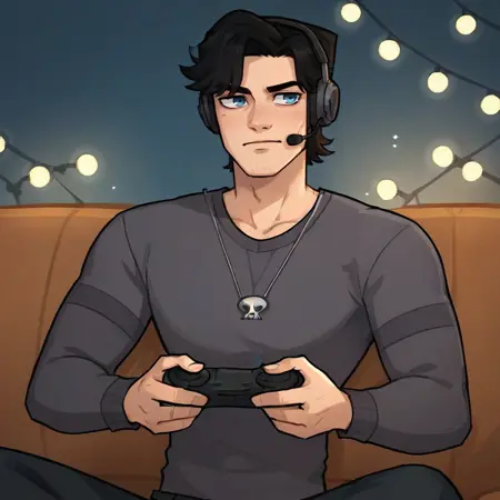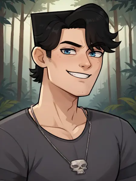プロンプト: Hunter_DVC、黒髪、スカルネックレス、青い目