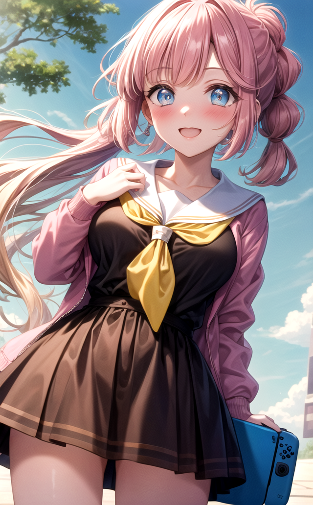 권장 태그: 분홍색 머리카락, 파란 눈, 곧은 앞머리, 발목 길이 머리, 측면 머리카락, 흘린 앞머리, 분홍색 머리카락, 그라데이션 머리카락, 이색 머리카락, 금발, 중간 크기의 가슴,
