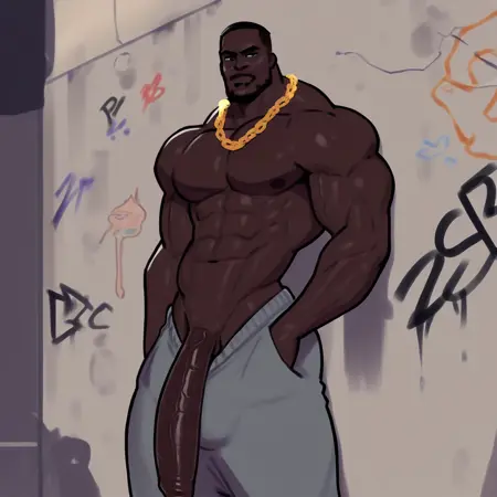 プロンプト: BBC_TP、BBC、肌の黒い男性、ゴールドチェーン、グレイのスウェットパンツ