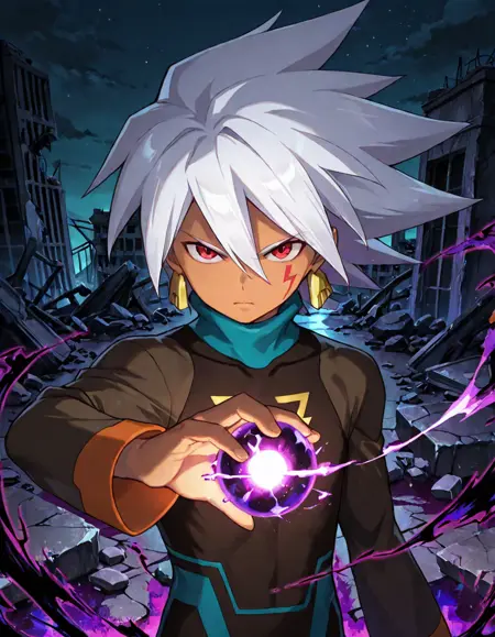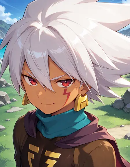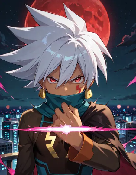 solo (mega man), solo, 1boy, white hair, spiked hair, hair between eyes, facial mark, white eyebrows, red eyes, dark skin, bodysuit, crest, earrings, long sleeves, orange sleeve cuffs