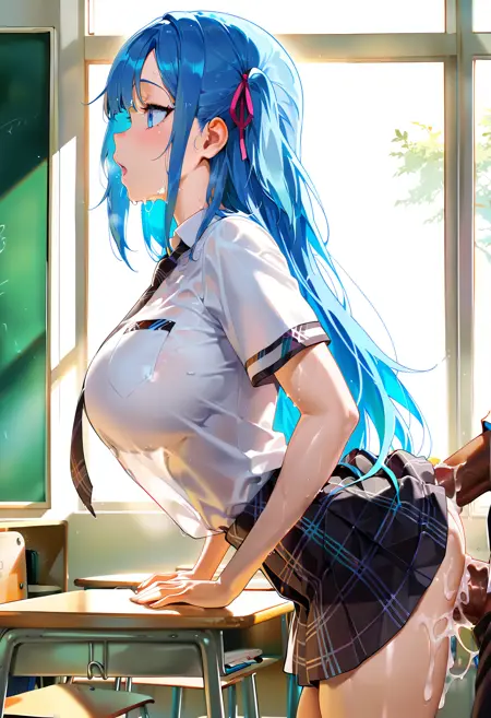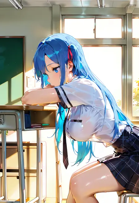 학교 복장: BCLara, 파란 머리카락, 파란 눈, 긴 머리카락, 머리 리본, 리본, ((학교 복장)), 큰 가슴, 넥타이, 주름치마, 체크무늬, 체크치마, 흰 셔츠, 짧은 소매
