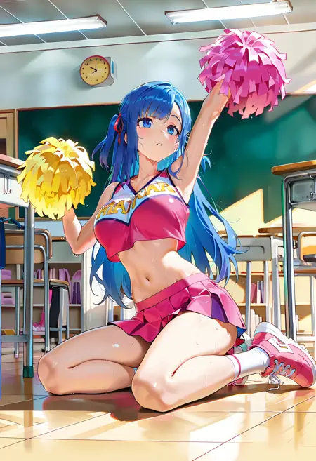 응원단 복장: BCLara, 파란 머리카락, 파란 눈, 긴 머리카락, 머리 리본, 리본, 큰 가슴, 퍼프팜, 퍼프팜(응원단), 응원단, 분홍 응원단 복장, 스니커즈, 양말, 소매 없음, 미니스커트, 분홍 치마, 분홍 신발, 복부 노출, 셔츠, 크롭탑