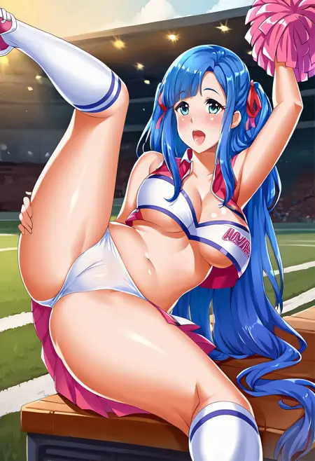 응원단 복장: BCLara, 파란 머리카락, 파란 눈, 긴 머리카락, 머리 리본, 리본, 큰 가슴, 퍼프팜, 퍼프팜(응원단), 응원단, 분홍 응원단 복장, 스니커즈, 양말, 소매 없음, 미니스커트, 분홍 치마, 분홍 신발, 복부 노출, 셔츠, 크롭탑