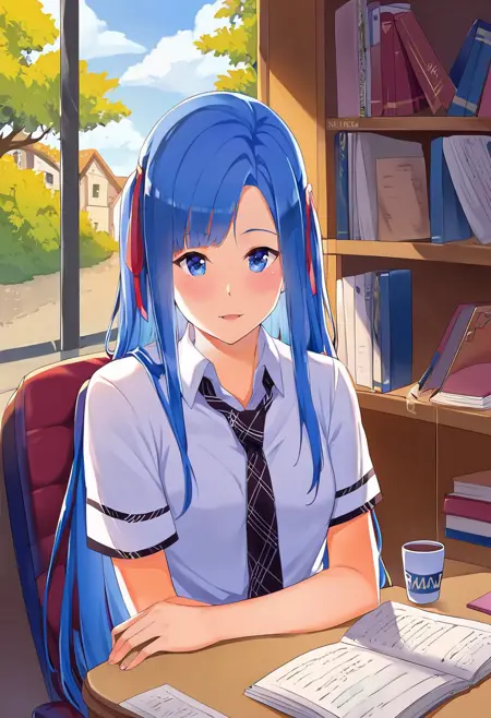 학교 복장: BCLara, 파란 머리카락, 파란 눈, 긴 머리카락, 머리 리본, 리본, ((학교 복장)), 큰 가슴, 넥타이, 주름치마, 체크무늬, 체크치마, 흰 셔츠, 짧은 소매