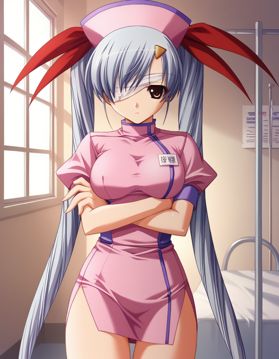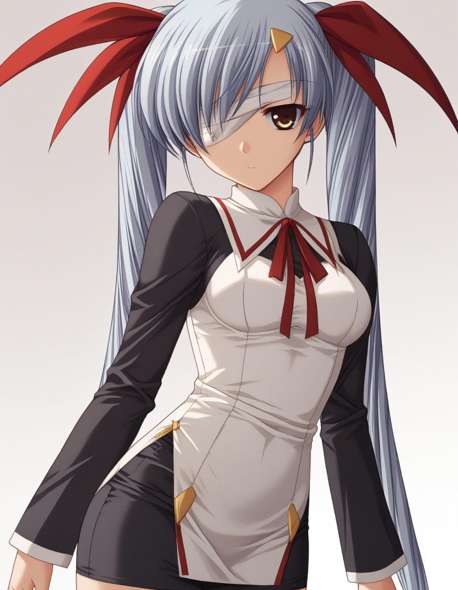 midou rin, white hair, long twintails, gold hair ornament, bandage over one eye, brown eyes