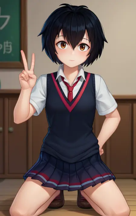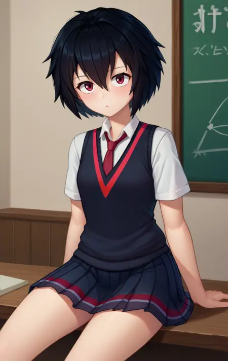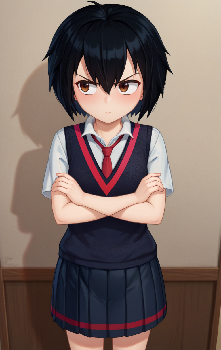 PennyParkerSDXL,solo,1girl,short hair,skirt,shirt,black hair,hair between eyes,brown eyes,school uniform,white shirt,short sleeves,pleated skirt,necktie,collared shirt,black skirt,dress shirt,red necktie,sweater vest