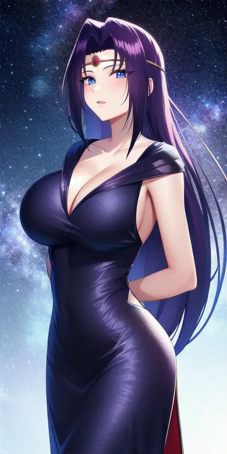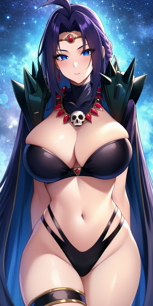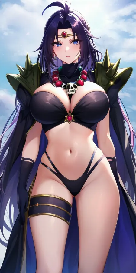 娜迦的经典装扮可通过以下部件生成:circlet, black_strapless_bra, black_multi-strapped_panties, shoulder_armor_spikes, black_turtleneck_collared_shrug, cape, thighlet, black_gloves, skull_necklace