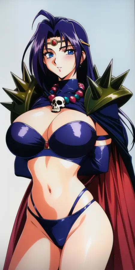 ナガのクラシックな衣装は、以下のアイテムで生成可能: circlet, black_strapless_bra, black_multi-strapped_panties, shoulder_armor_spikes, black_turtleneck_collared_shrug, cape, thighlet, black_gloves, skull_necklace