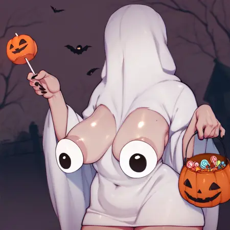 b00bieghost, ghost costume, exposed breasts, covered nipples, eyes, faceless,