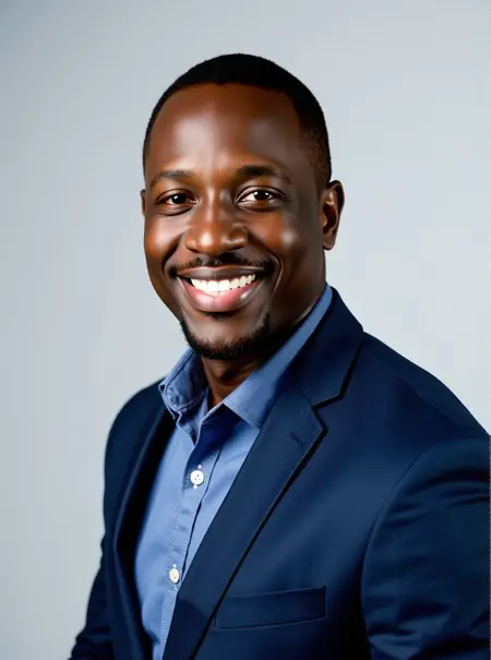 简单提示:“一个人正对镜头摆拍专业领英头像,面带淡淡微笑。”