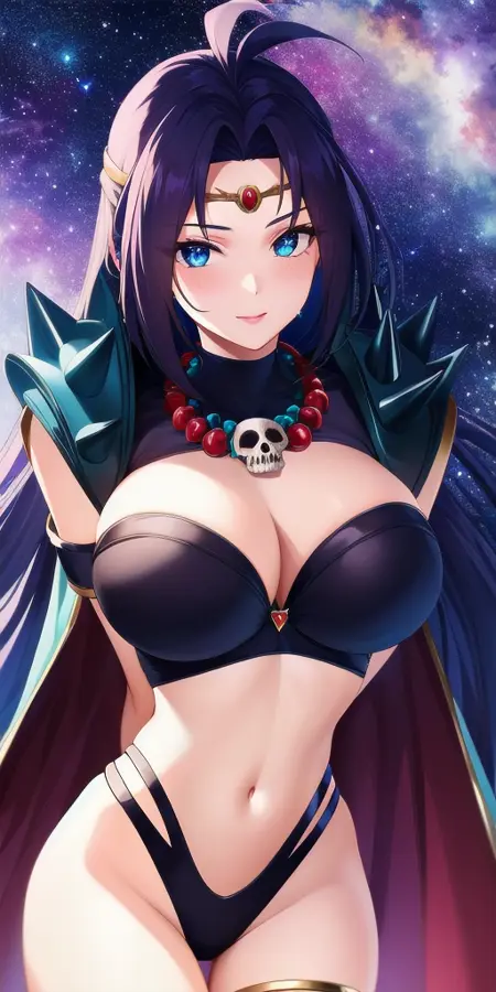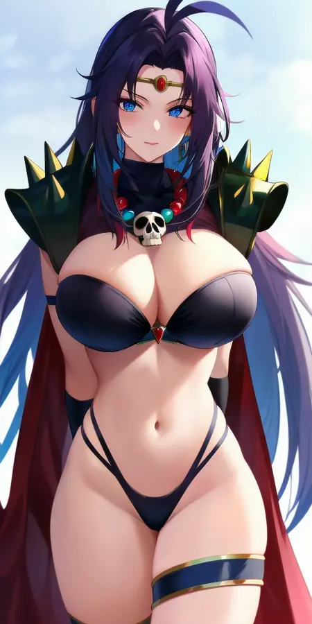 나가의 클래식 복장은 다음 항목으로 생성 가능: circlet, black_strapless_bra, black_multi-strapped_panties, shoulder_armor_spikes, black_turtleneck_collared_shrug, cape, thighlet, black_gloves, skull_necklace