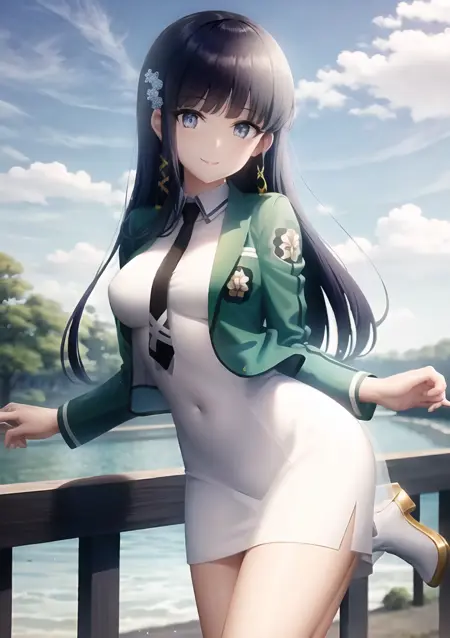 학교 uniform, 검정 넥타이, 흰색 드레스, 초록색 재킷, 긴 sleeves, 오픈 재킷, 하이힐