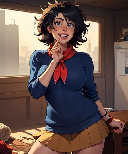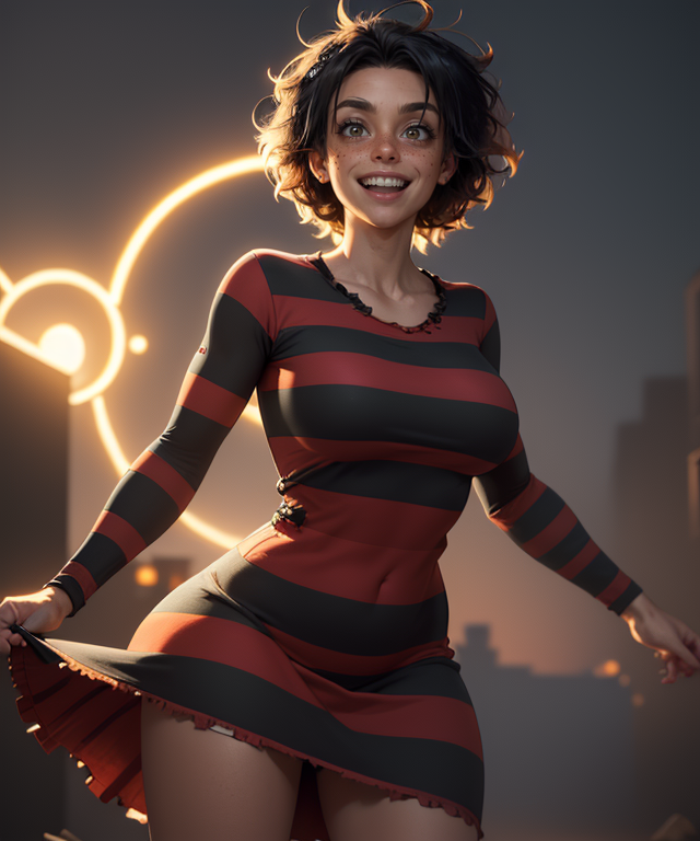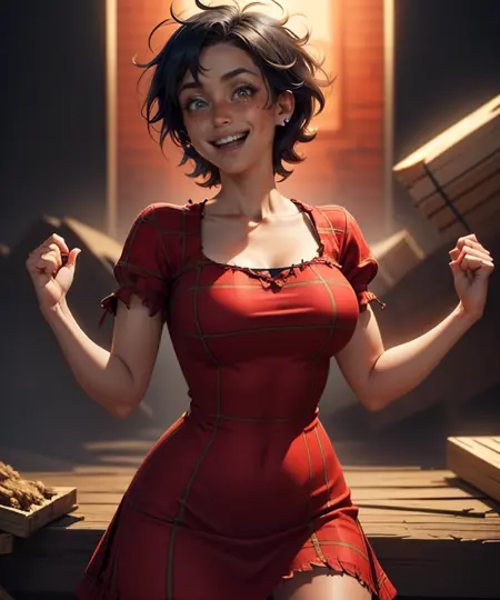 外見プロンプトヘルパー: black_hair, short_hair, messy_hair, freckles, black_eyes, crazy_smile, crazy_eyes, crazy_expression, laughing,