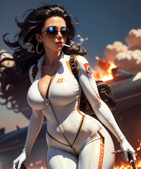 FLIGHT SUIT プロンプト補助: JetGirlWhite, white_bodysuit, shiny_bodysuit, blue_accents, zipper_front, unzipped, open_collar, open_clothes, cleavage, white_gloves, white_sleeves, long_sleeves, black_sunglasses, round_sunglasses,