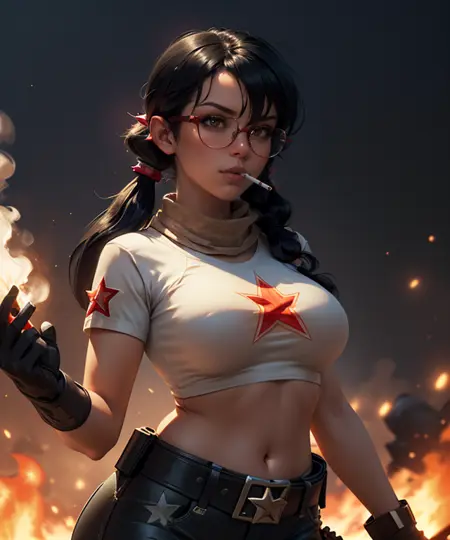 STAR SHIRT プロンプト補助: JetGirlStars, tight_black_pants, white_crop_top, white_shirt, white_short_sleeves, red_star_on_chest, star_symbol, black_gloves, black_scarf, brown_belt, star_belt_buckle, holsters,