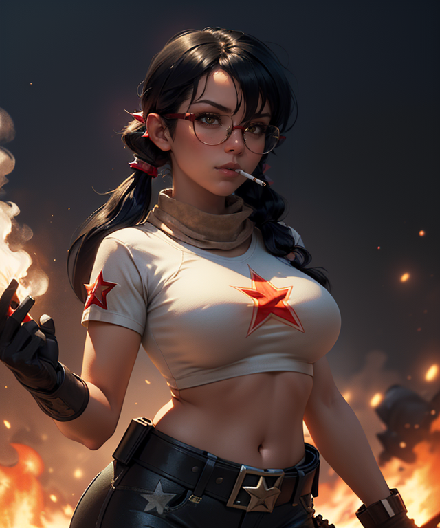 BLACK JACKET プロンプト補助: JetGirlJacket, black_jacket, tight_sleeves, open_clothes, long_sleeves, tight_black_pants, black_jacket, white_shirt, midriff, red_star_on_chest, star_symbol, black_gloves, red_scarf, brown_belt, star_belt_buckle, holsters,