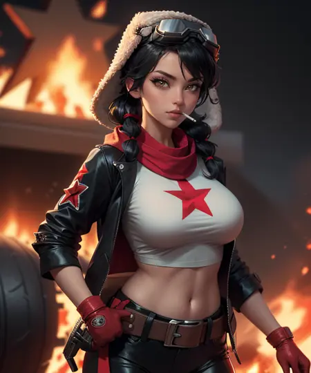BLACK JACKET prompt helpers: JetGirlJacket, black_jacket, tight_sleeves, open_clothes, long_sleeves, tight_black_pants, black_jacket, white_shirt, midriff, red_star_on_chest, star_symbol, black_gloves, red_scarf, brown_belt, star_belt_buckle, holsters,